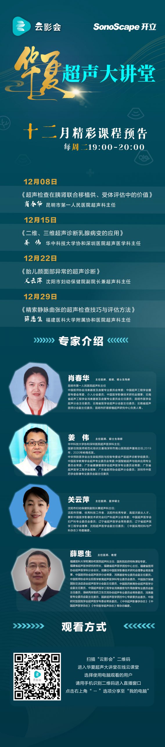 《华夏超声大讲堂》是在“云影会”平台的网络课堂。旨在邀请来自全国各地有影响力的超声专家进行超声影像学的学术交流授课,从而普及和规范超声医学在临床中的应用,欢迎大家学习。